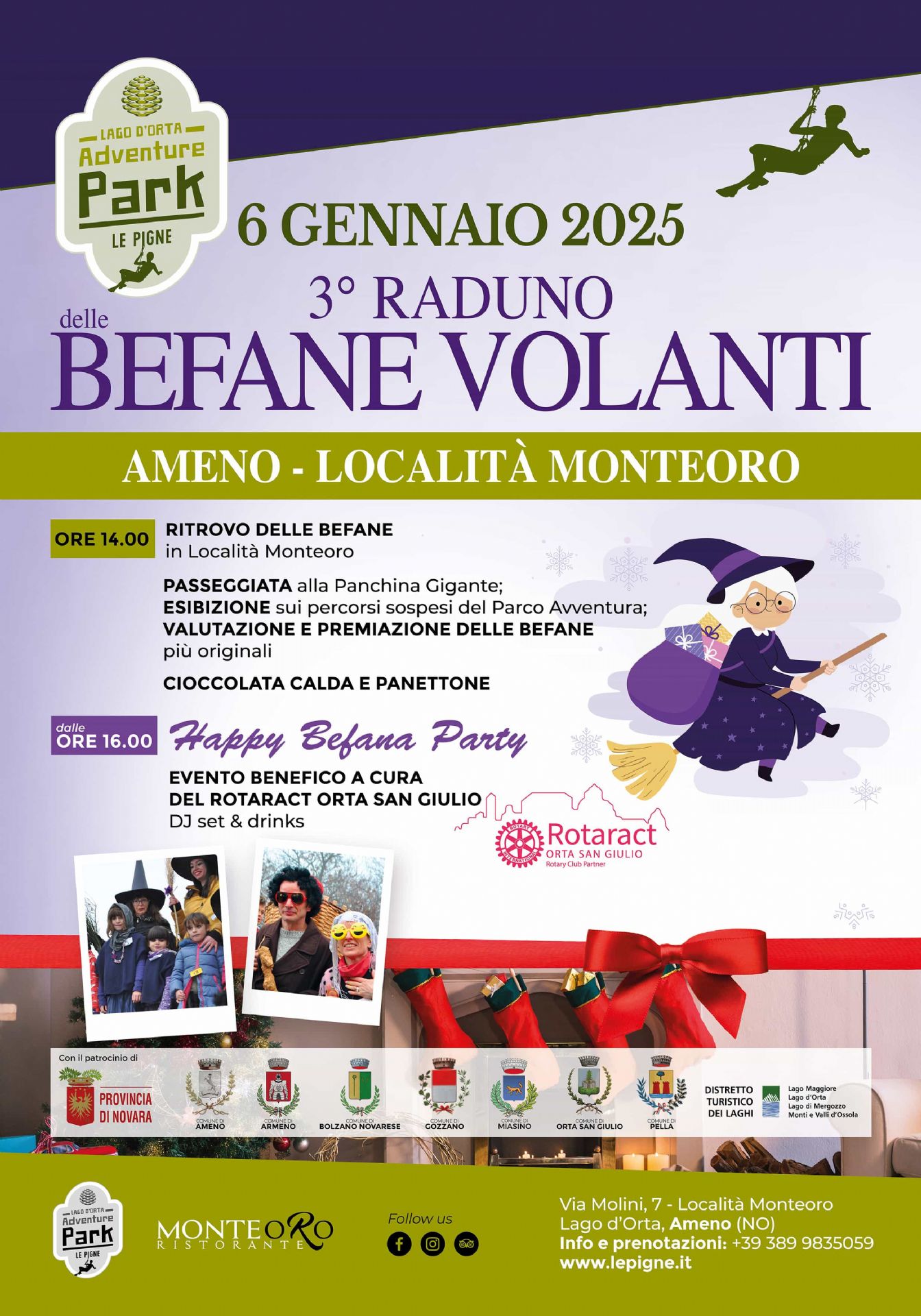 Anche quest'anno, presso il Parco Avventura Le Pigne di Ameno, ci sarà il tradizionale raduno delle befane, le quali concorreranno ad aggiudicarsi l’ambito trofeo BEFANA VOLANTE 2025 realizzato dallo scultore armeniese Marco Vecchi.