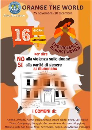 ORANGE THE WORLD è la Campagna Internazionale contro la violenza di genere. L'iniziativa, che si terrà nei sedici giorni che vanno dal 25 novembre - Giornata internazionale per l’eliminazione della violenza contro le Donne, fino al 10 dicembre - Giornata internazionale dei diritti umani, è promossa da Soroptimist International, organizzazione femminile mondiale nata negli USA nel 1921 e condivisa da Soroptimist Alto Novarese, presente sul nostro territorio dal 2006.