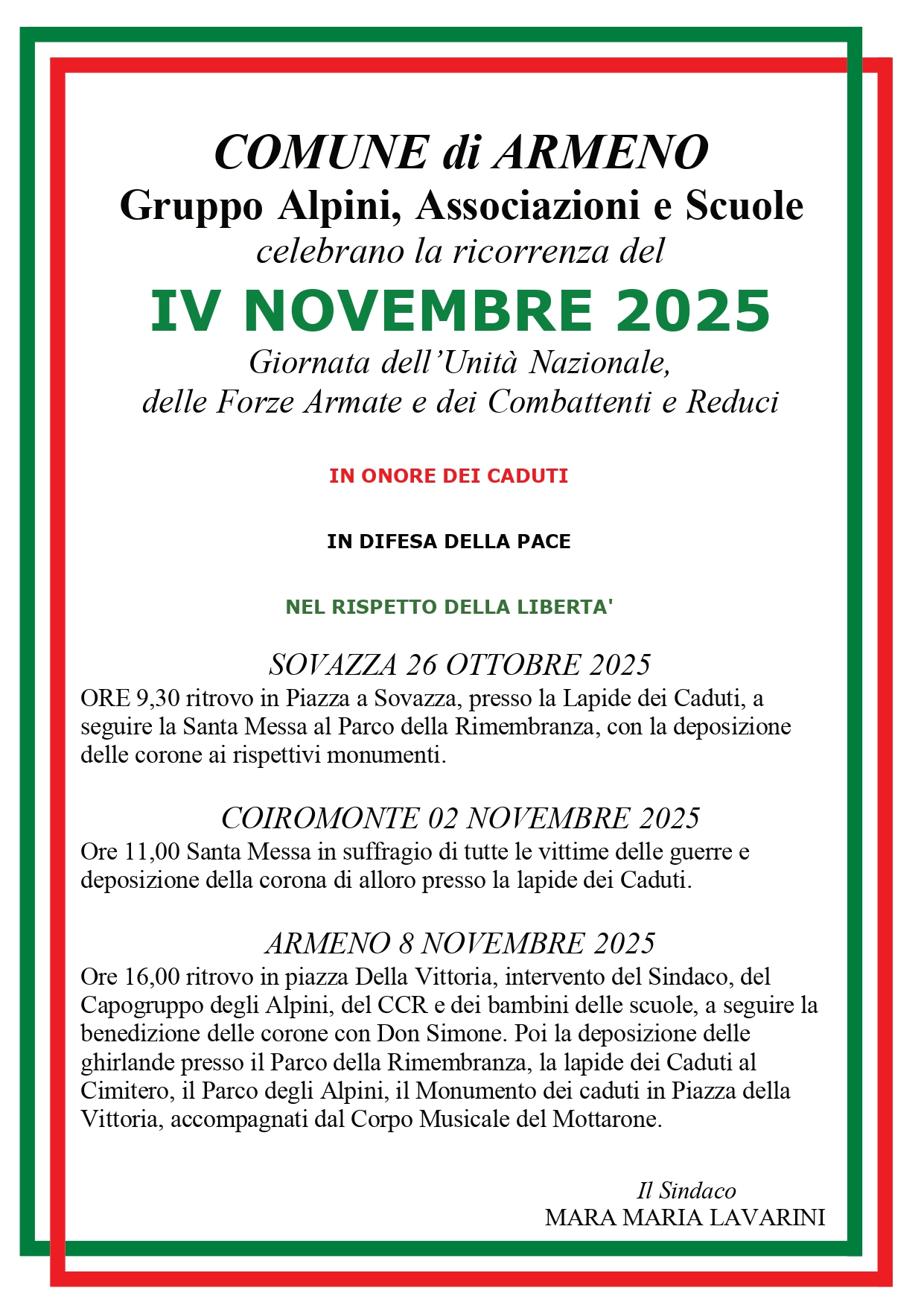A nome dell'Amministrazione Comunale e della comunità rinnovo la nostra gratitudine a tutti coloro che servono il Paese e a tutti coloro che credono nel valore dell'unità, della pace e della solidarietà.