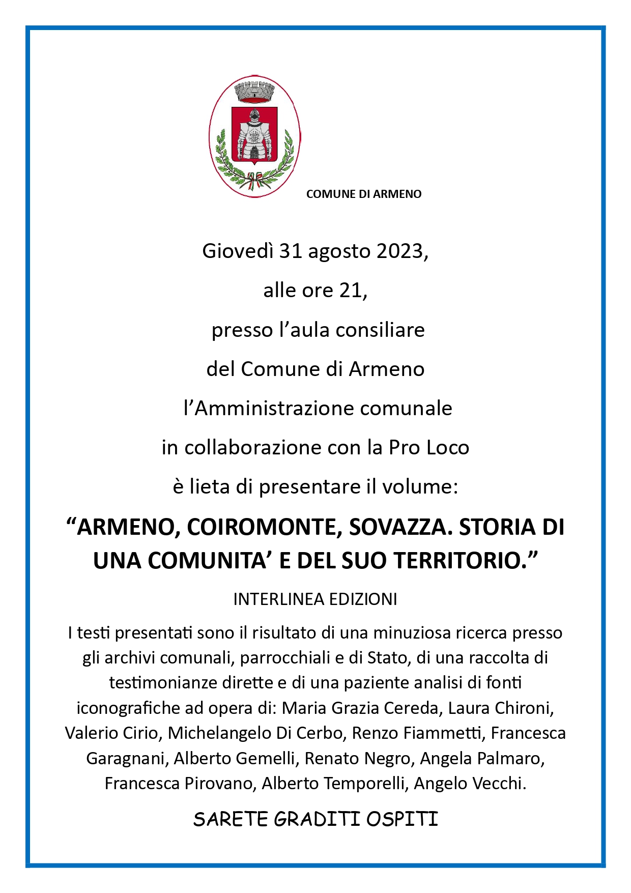 In allegato la locandina sul volume "ARMENO, COIROMONTE, SOVAZZA. STORIA DI UNA COMUNITA' E DEL SUO TERRITORIO".