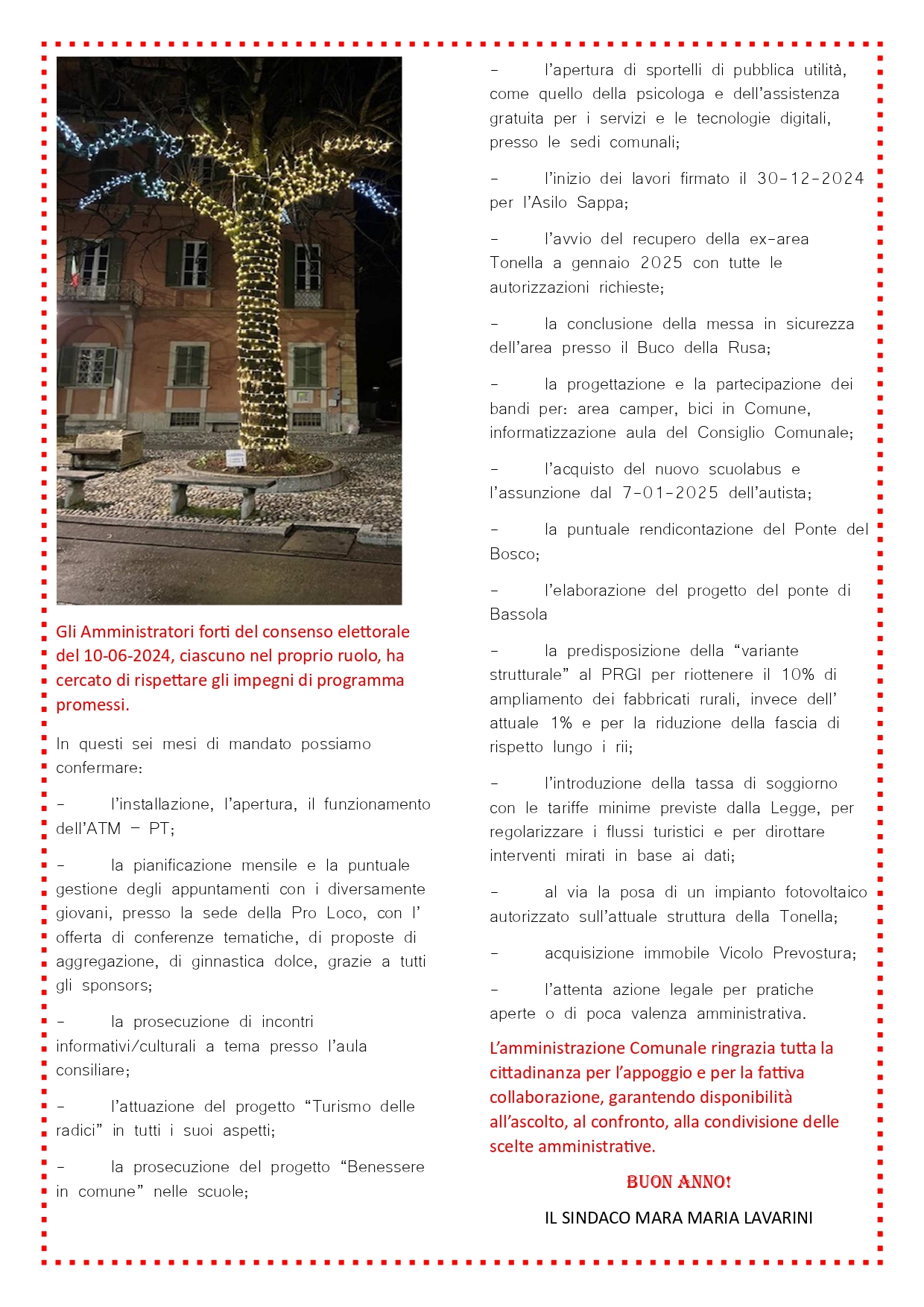 Nell'augurare a tutta la cittadinanza una buona chiusura dell'anno 2024, con l'augurio che il nuovo anno possa esaudire le aspettative di tutti, si allega una sintesi di quanto attuato in questi sei mesi di amministrazione.