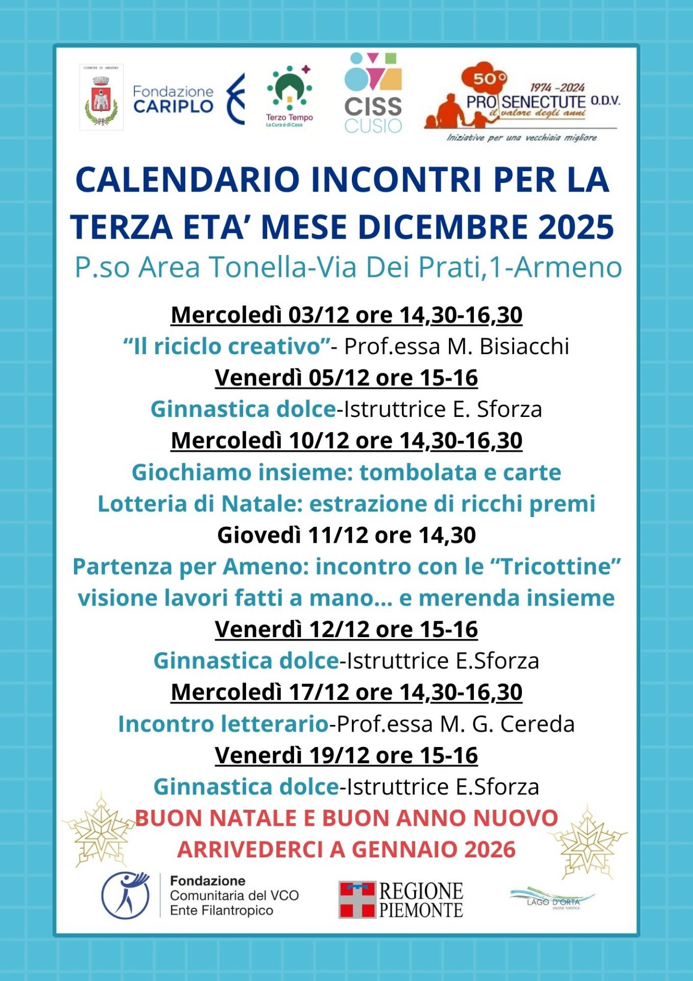 In allegato la locandina degli incontri del mese di dicembre 2025 per tutti coloro che vogliono passare due pomeriggi insieme di cultura, di manipolazione, di divertimento, ...