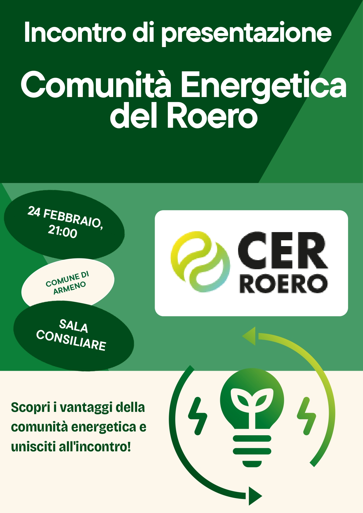 In allegato l'invito a partecipare all'incontro di presentazione della "CER Roero" aperta a tutto il territorio del Piemonte: martedì 24 febbraio, alle ore 21, in aula consiliare.