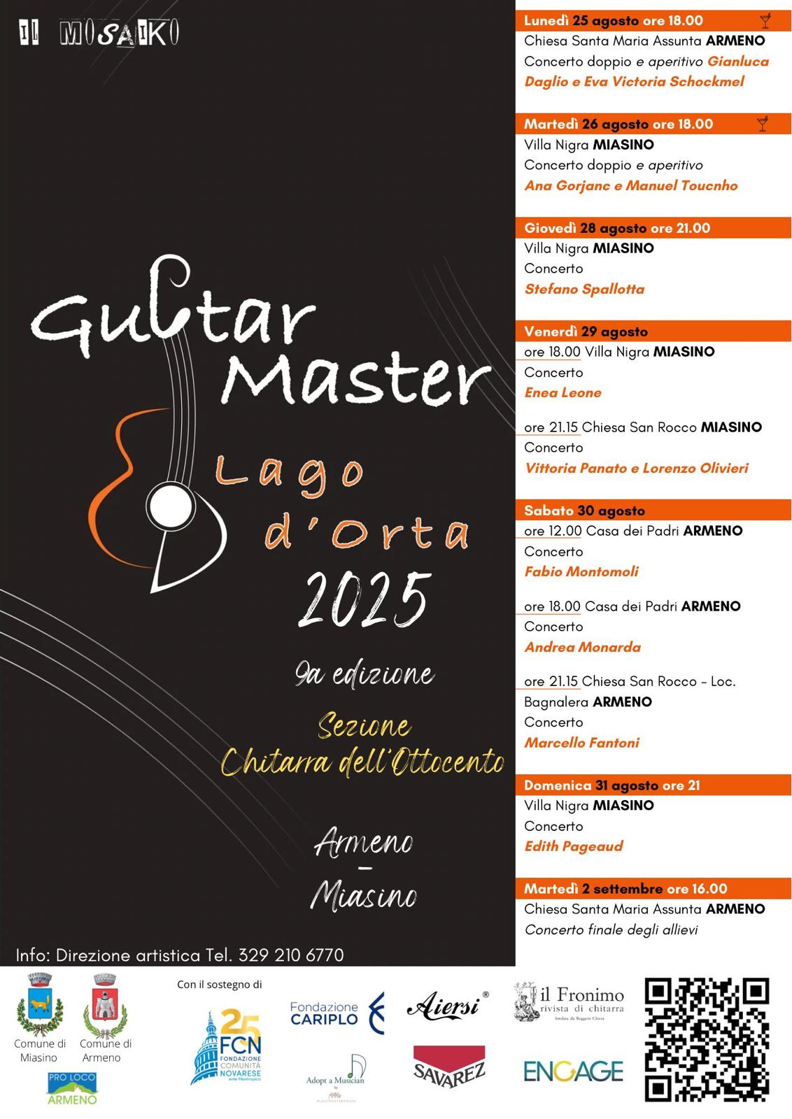 Anche quest'anno ci sarà la nona edizione del Guitar Master del Lago d'Orta con concerti, spettacoli, conferenze esposizioni di liuteria, masterclass, distribuiti tra Armeno, Miasino, al fine di promuovere la cultura musicale nelle sue ampie e differenziate sfaccettature.