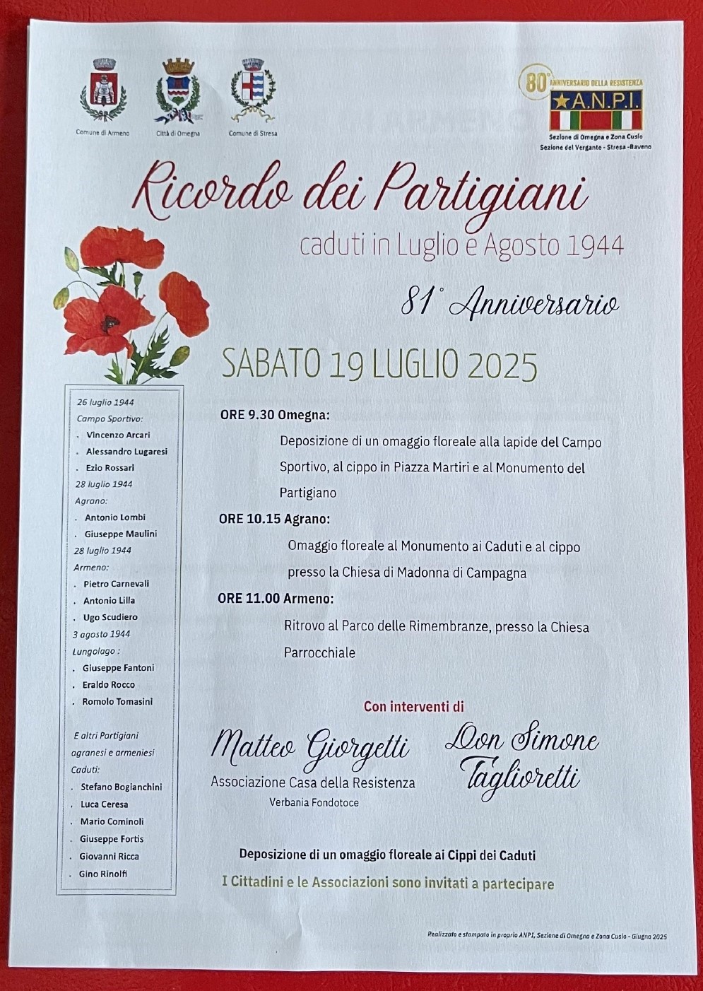 Commemorazione dei Caduti nel luglio e nell'agosto 1944: 81° Anniversario, sabato 19 luglio 2025 ore 11. In allegato la locandina.
