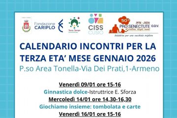 Dopo la pausa natalizia Marinella, Antonella, Lucia riprendono gli incontri con la terza età con il programma del mese di gennaio che si allega, sempre ricco di proposte e sempre vario di attività...