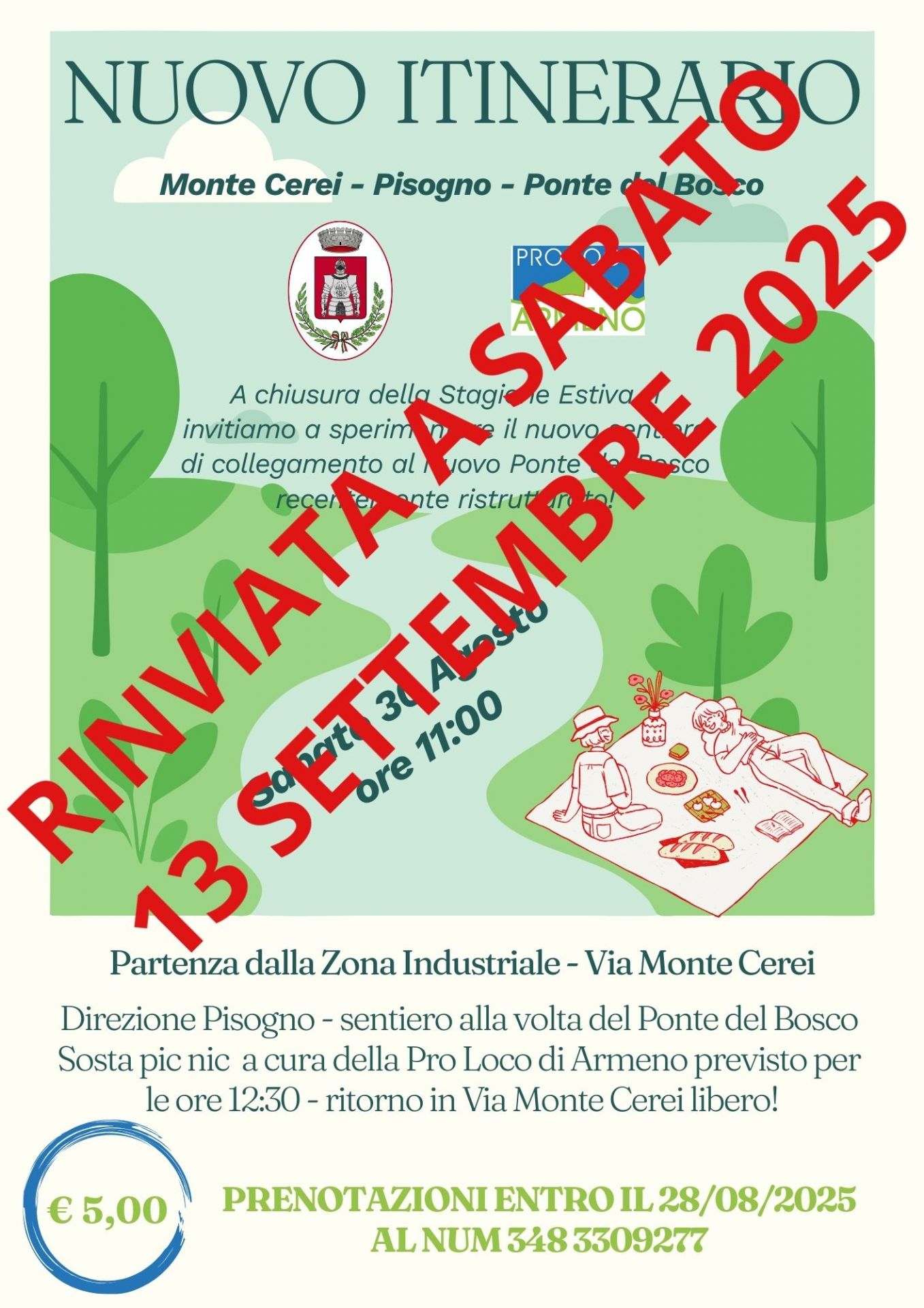 Si avvisa che la passeggiata pic-nic prevista per domani 30 agosto, a causa delle condizioni meteo avverse, è stata rinviata a sabato 13 settembre 2025.
