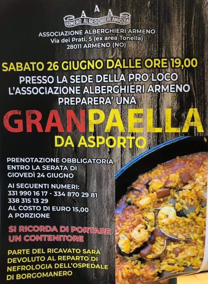 PRESSO LA SEDE DELLA PRO LOCO L'ASSOCIAZIONE ALBERGHIERI ARMENO PREPARERA' UNA GRANPAELLA DA ASPORTO.