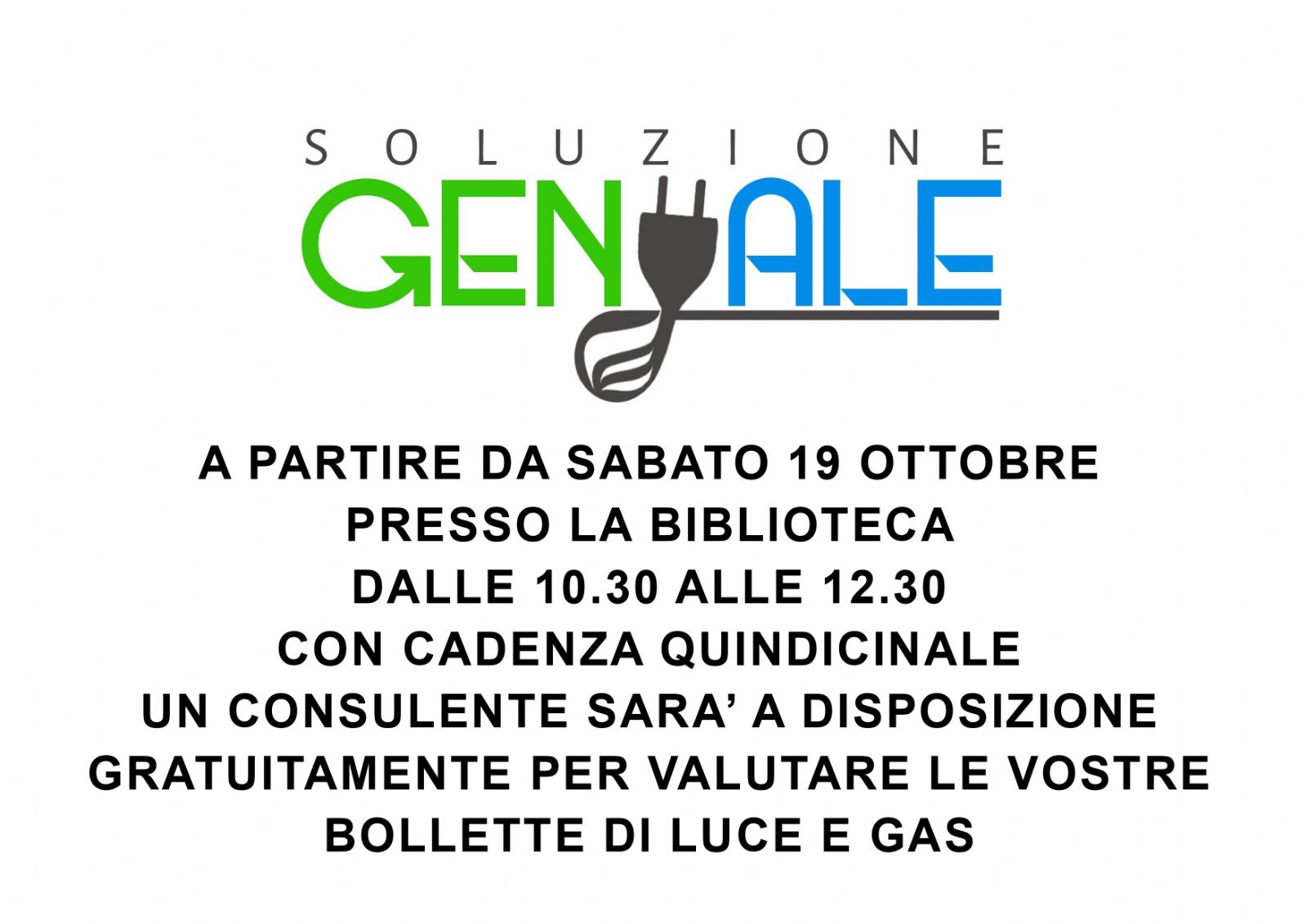 A PARTIRE DA SABATO 19 OTTOBRE PRESSO LA BIBLIOTECA DALLE 10.30 ALLE 12.30 CON CADENZA QUINDICINALE UN CONSULENTE SARA' A DISPOSIZIONE GRATUITAMENTE PER VALUTARE LE VOSTRE BOLLETTE DI LUCE E GAS