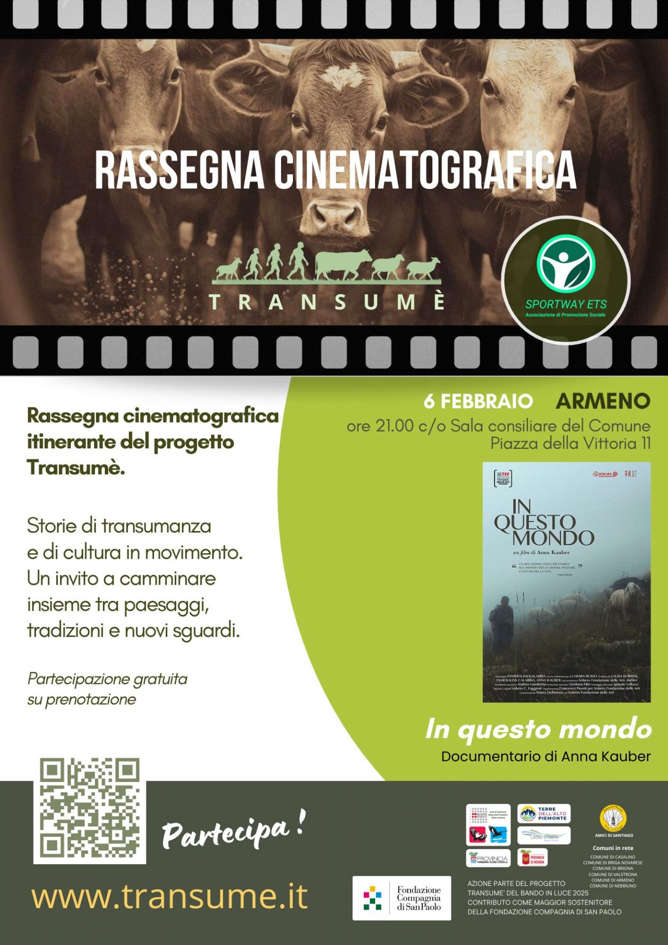 Prosegue il viaggio della rassegna cinematografica itinerante del Progetto TRANSUMÈ promosso dall'associazione Sportway Aps e dedicato alla scoperta della transumanza e della sua valenza economica, culturale e valoriale ed anche il nostro Comune ha aderito.